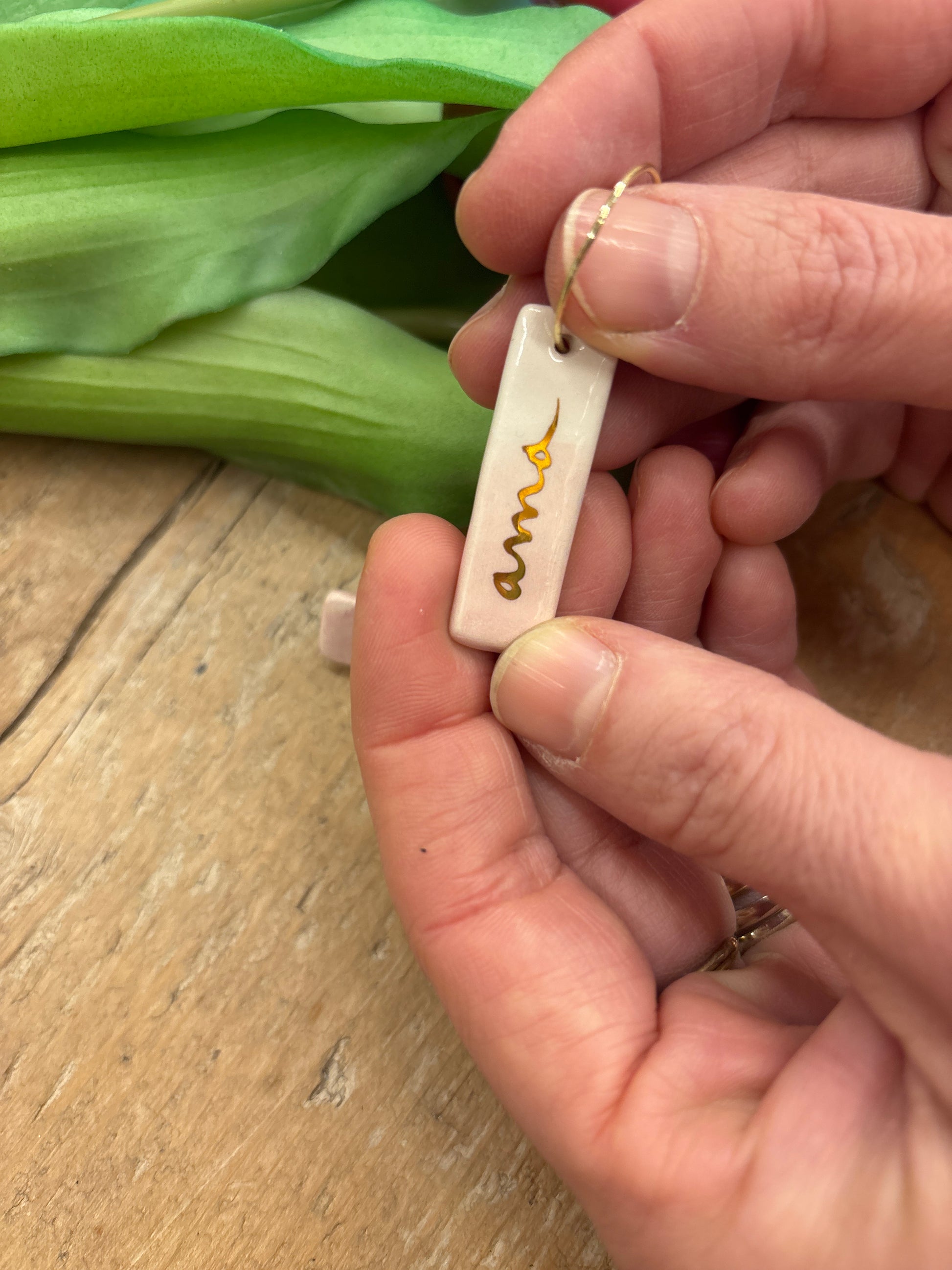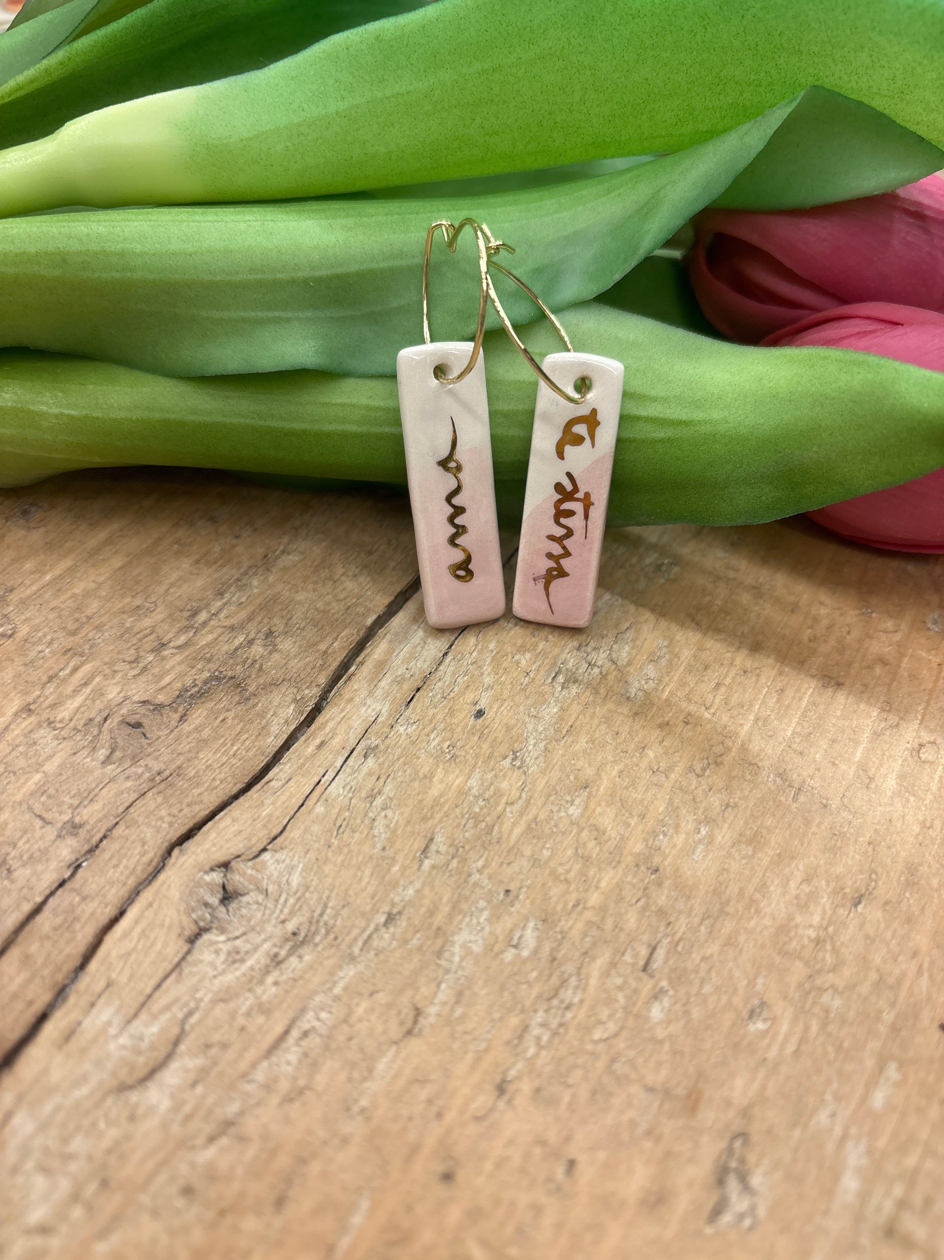 Orecchini in ceramica fatti e dipinti a mano con scritta in oro 24 kt.