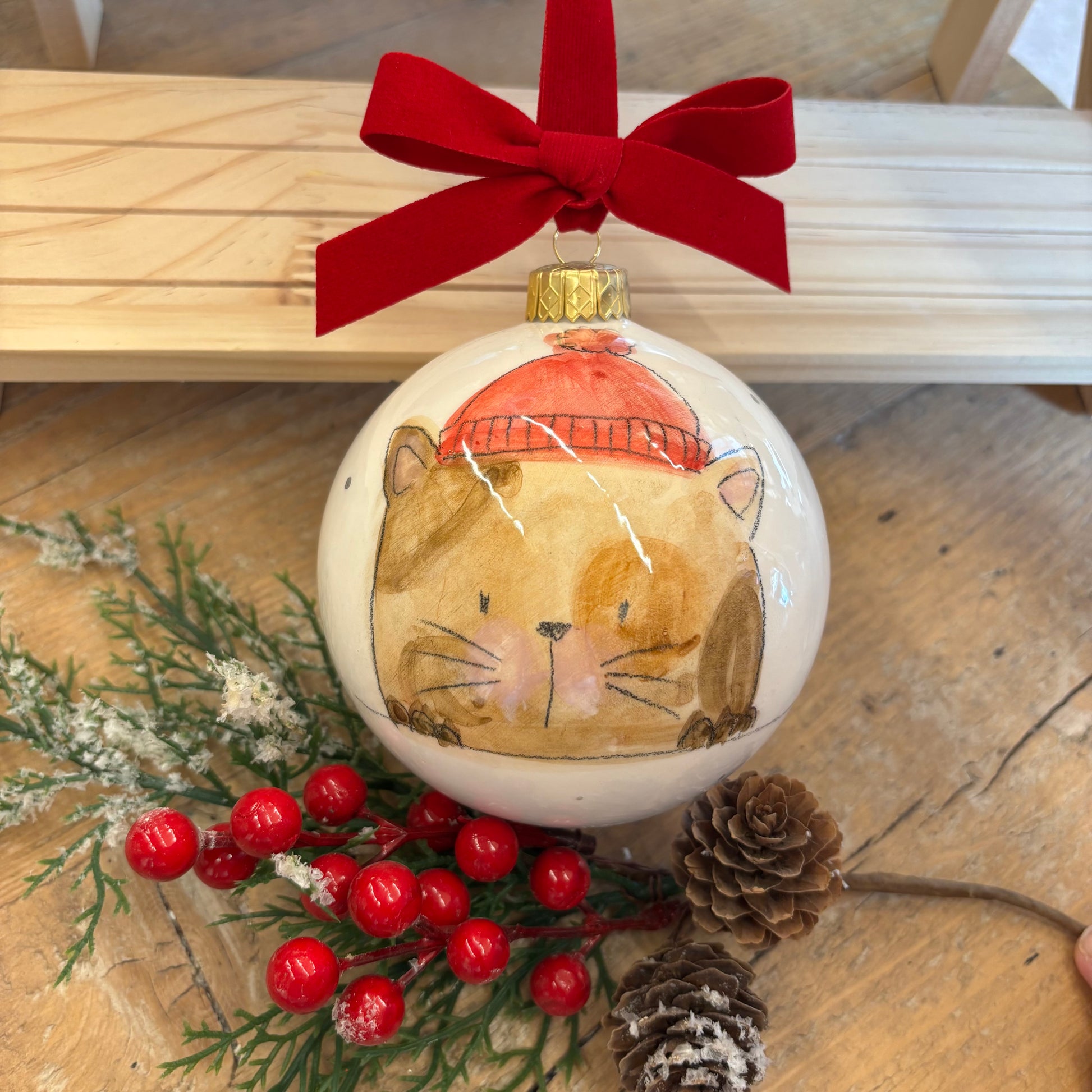 Pallina in ceramica diametro 8cm decorata a mano con scritta BUON NATALE. Il colore del gatto può differire dal disegno.