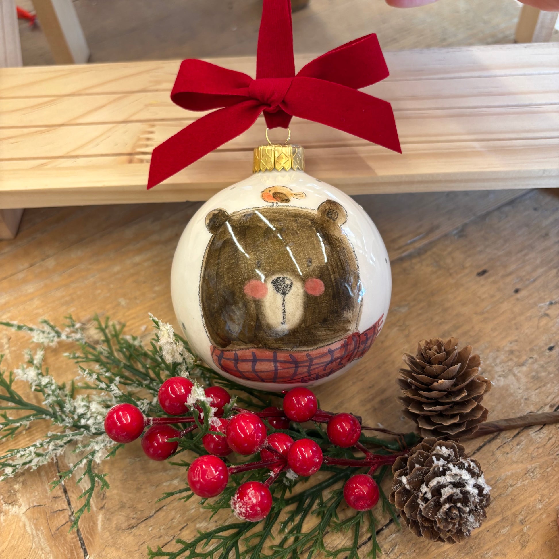 Pallina in ceramica diametro 8cm decorata a mano con scritta BUON NATALE. Il colore della sciarpa può variare.