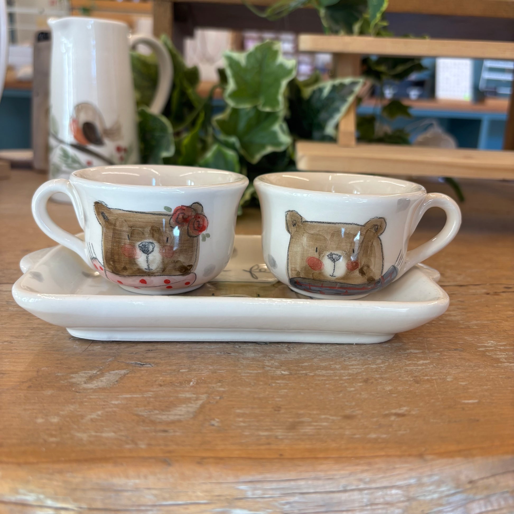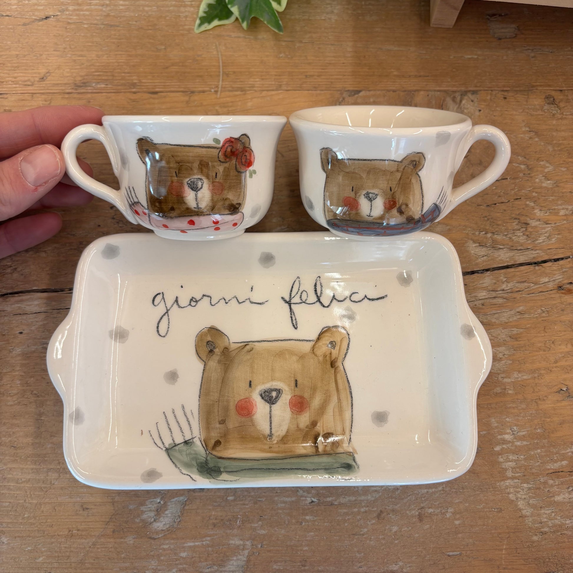 Servizio da caffè per due con vassoietto e due tazzine in ceramica dipinte a mano da noi. Sono tutti pezzi unici ed è per questo che potranno differire dalle foto .