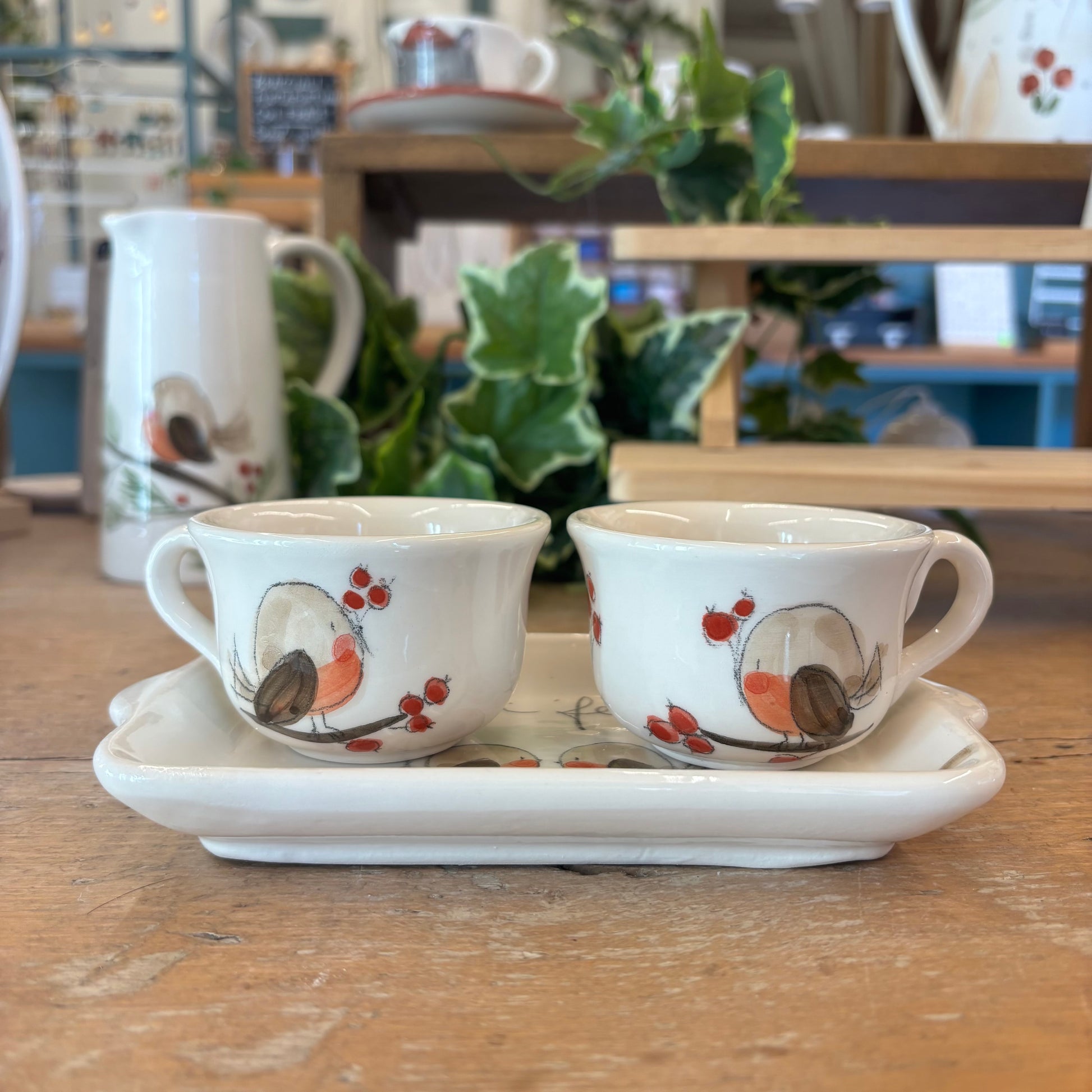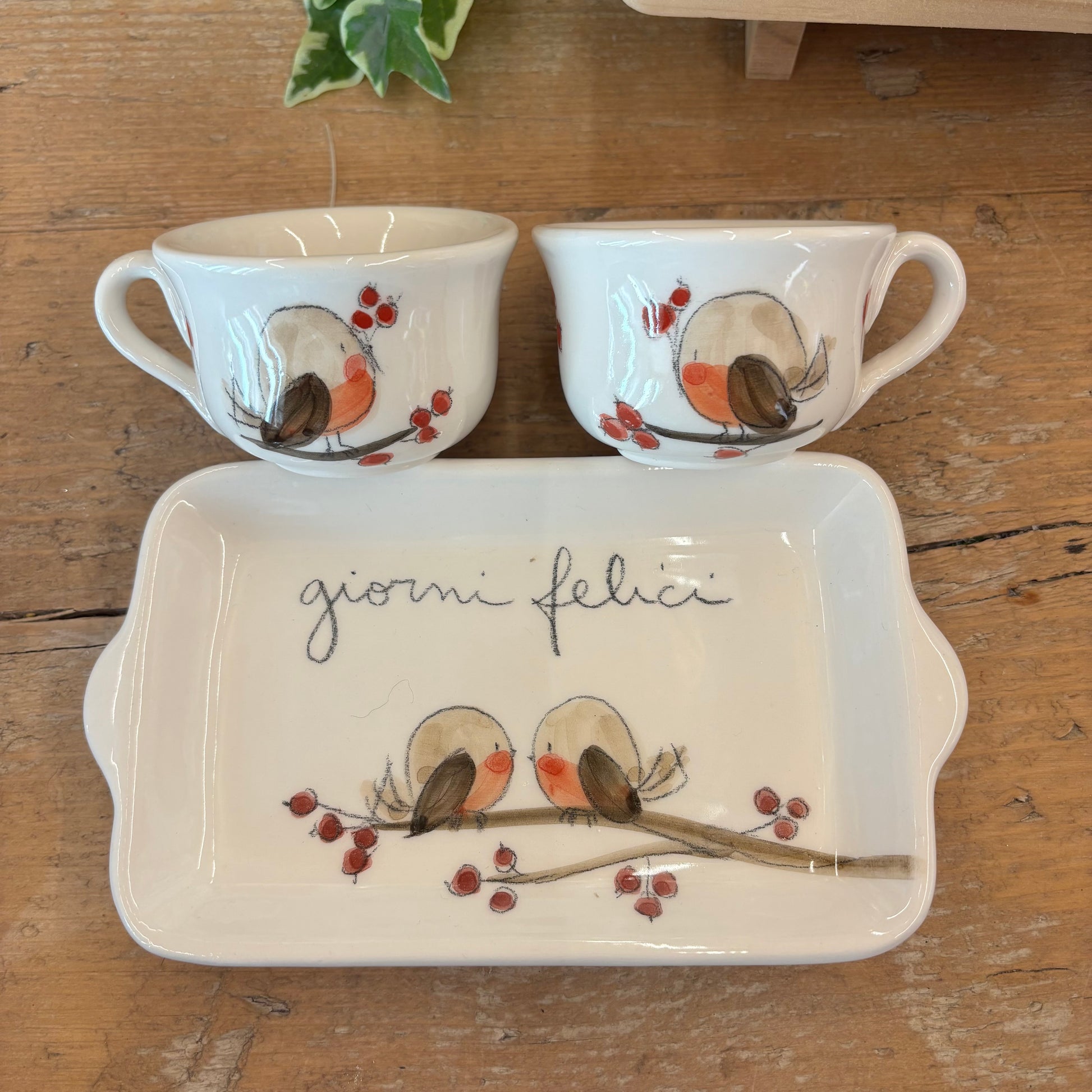 Servizio da caffè per due con vassoietto e due tazzine in ceramica dipinte a mano da noi. Sono tutti pezzi unici ed è per questo che potranno differire dalle foto .